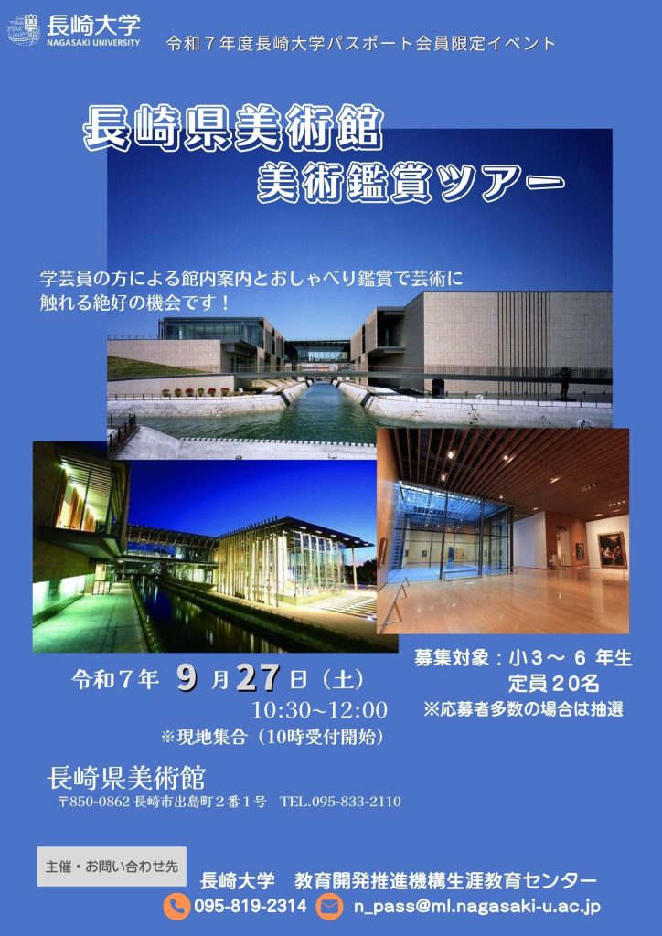 令和7年度長崎大学パスポート会員限定イベント「長崎県美術館美術鑑賞ツアー」を開催します。学芸員の方の説明を受けながら館内を案内してもらいます。また、美術館所蔵のコレクション展示作品を楽しくおしゃべりしながら鑑賞します。