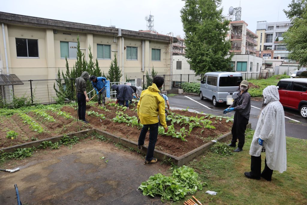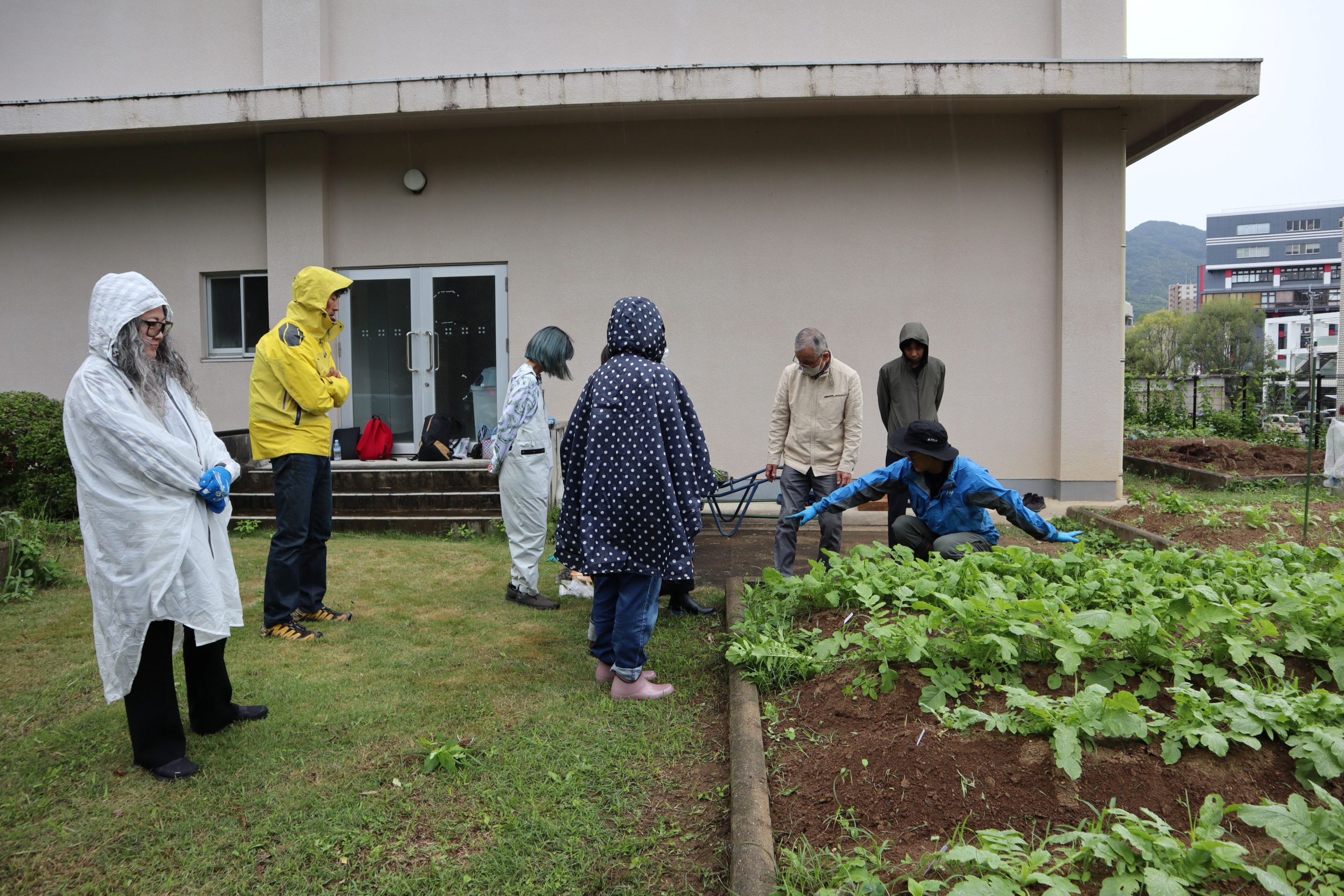 小雨の中で、よい苗を残すための間引き、しっかり育つよう追肥を行いました。
